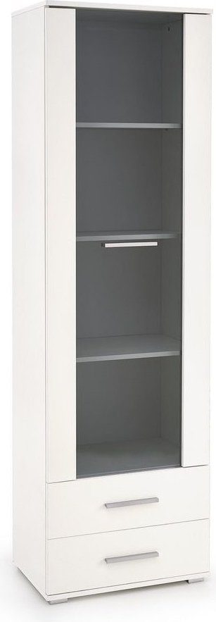 Ett härligt vitrinskåp med en modern design. Vitrinskåpet är tillverkat av laminerad MFP (premium träskiva) med en härlig högblank finish. Skåpsdörren är av glas och skåpet är rustat med 4 hyllplan och 2 lådor för smart förvaring.