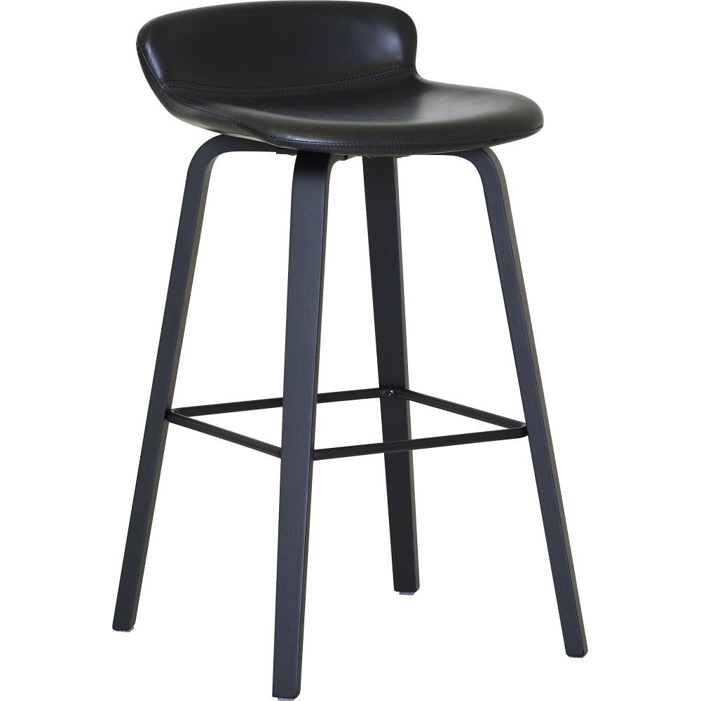 Barstol med svart PU-klädsel, svartlackade träben och metallfotstöd.