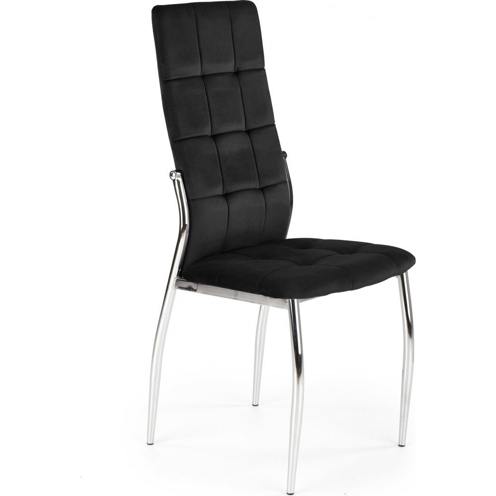Matstol med underrede av kromat stål och klädsel av sammetstyg.