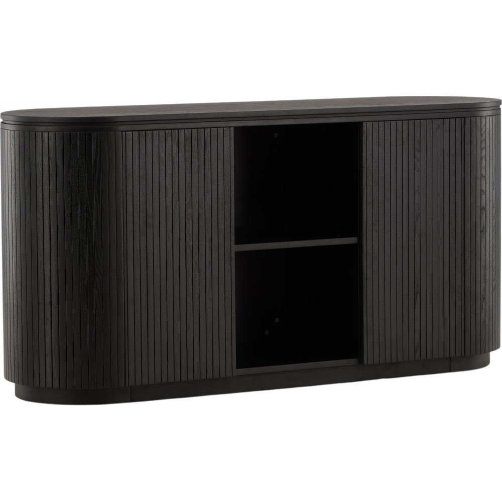 En oval skänk som möjliggör både synlig och dold förvaring. Skänken har en smäcker, skandinavisk design i svart ek med faner. Här finns både skåp för dold förvaring och två öppna hyllplan som passar utmärkt för lite vackra inredningsdetaljer eller små ljuslyktor. Höj stilnivån i ditt hem med en trendsäker förvaringsmöbel som står sig över tid.