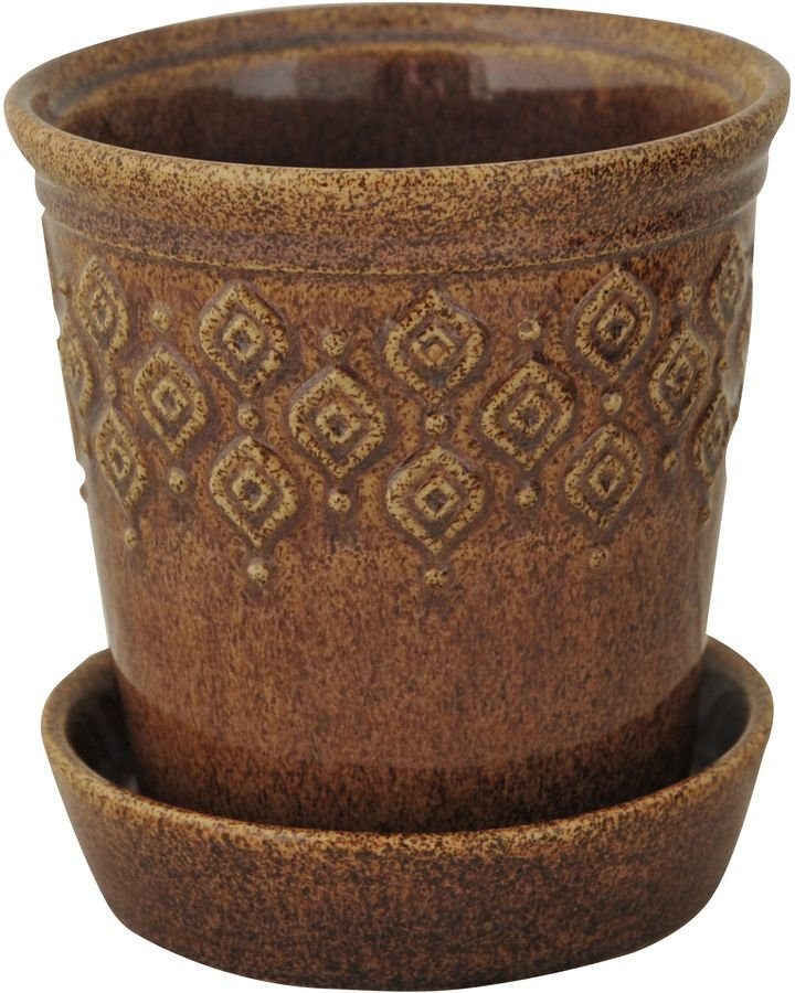 Blomkruka i glazed brun keramik med vattenfat.