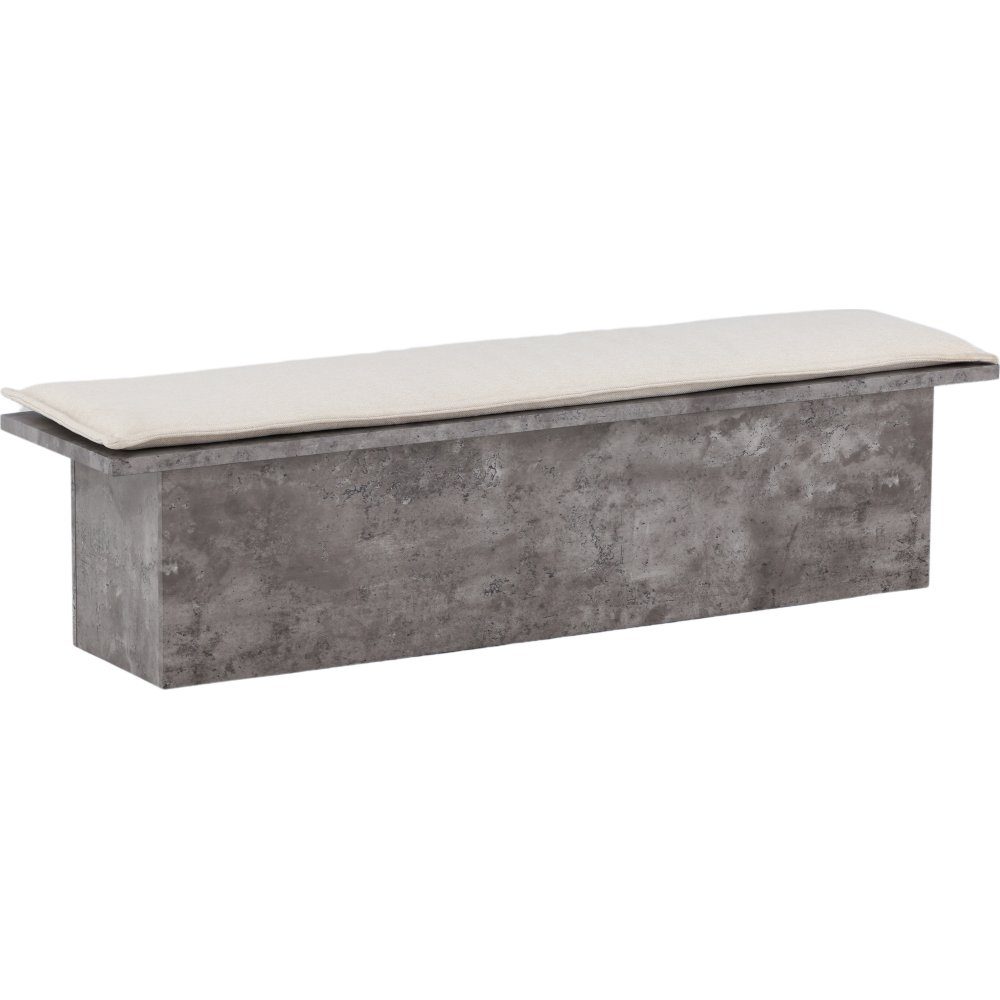 Bänk med rektangulär sits som har beige dyna och integrerat underrede format likt ett rätblock i industriell design. Tillverkad i grå sten-look som ger ett spräckligt liv åt möbeln. Den här bänken är en perfekt inredningsdetalj till hallen eller vardagsrummet, som solitär stilikon eller för att skapa fler sittplatser i hemmet.
