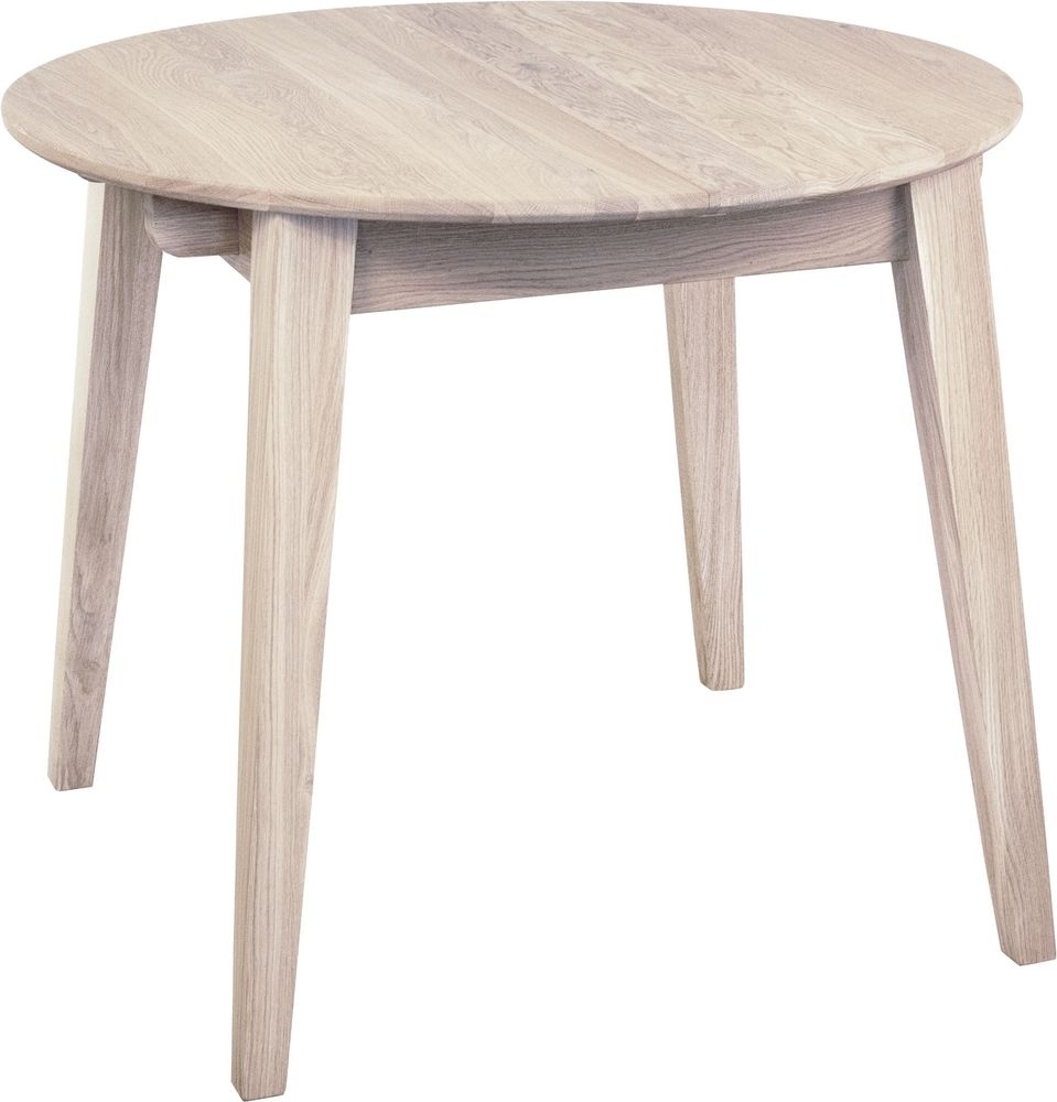 Genova matgrupp bestående av ett runt/ovalt matbord i vitpigmenterad ek som praktiskt och smidigt kan förlängas från 90 cm till 130 cm.