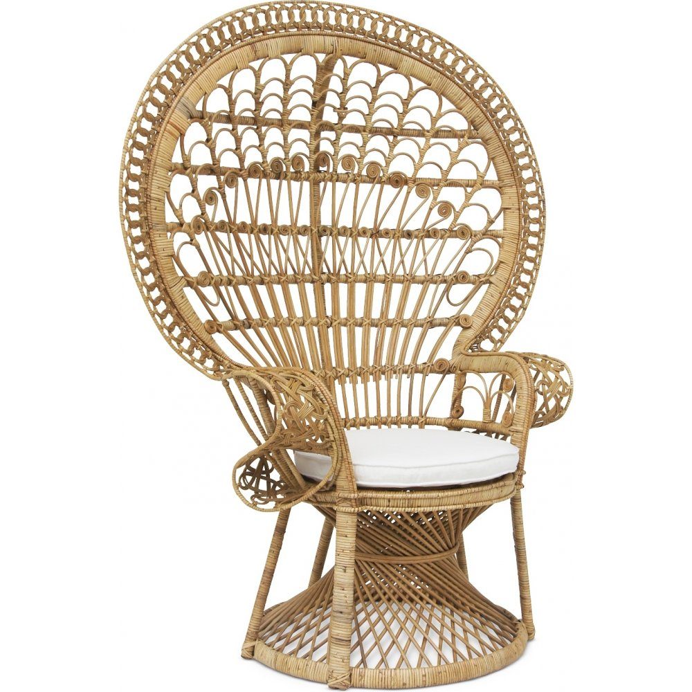 Påfågel fåtölj, även känd som Peacock, är en klassisk möbel tillverkad av flätad och bunden naturlig rotting. Denna fåtölj är ett fantastiskt handarbete som erbjuder hållbarhet och tidlös skönhet. Med en rund sittdyna i ljust tyg kombinerar den både komfort och stil, vilket gör den till ett perfekt tillskott till alla hem.