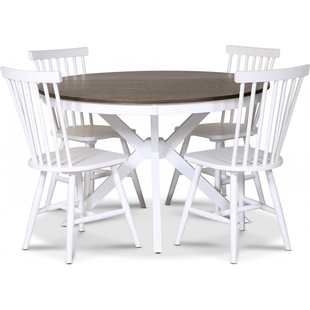 Skagen matgrupp; runt matbord Ø120 cm - Vit / brunoljad ek med 4 st vita Karl Pinnstolar: