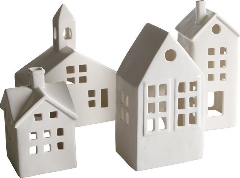 Dekorativa hus i stengods med plats för värmeljus inuti.