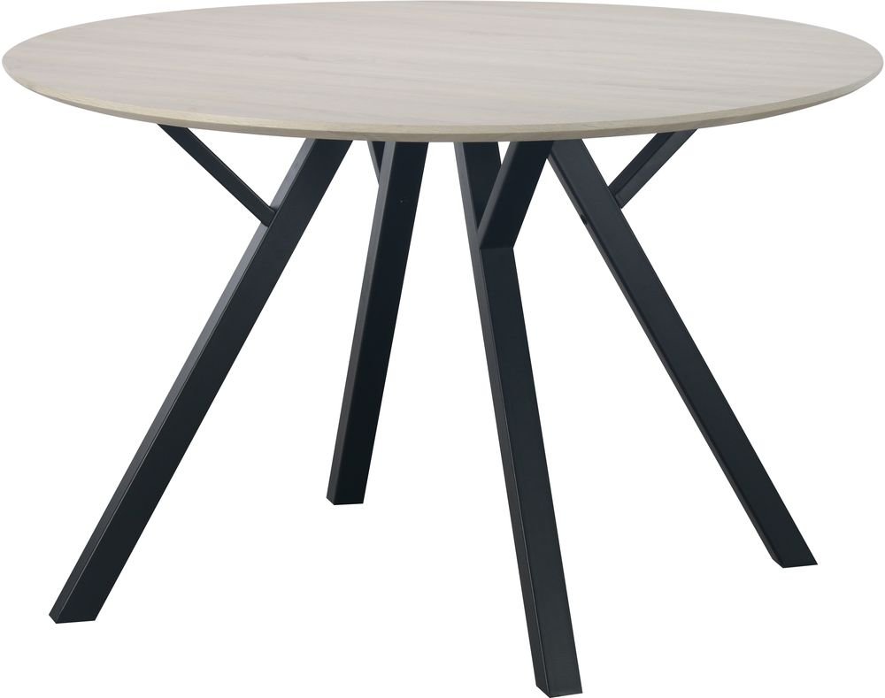 Matgrupp från Skånska Möbelhuset, Smokey matbord 120 cm i diameter med mdf-toppskiva med ljus betsad ekfoliering. Medföljer 4 st matchande Carisma sammetstolar i bordeauxfärgat sammet med svarta ben.