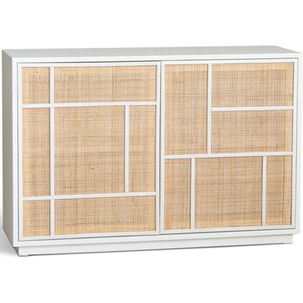 Stockholm sideboardet i vitt trä med fronter i ljus rotting. Sideboardet innehåller två fasta hyllplan. Detta sideboard har bra förvaringsmöjligheter.