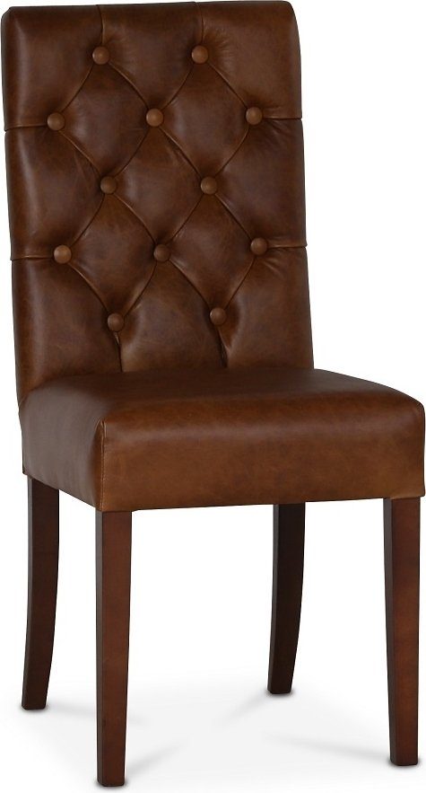 Matstol från Skånska Möbelhuset i massiv brunbetsade träben, Sits och rygg klädd i ett brunt anilinläder. Ryggen är med djuphaftade knappar för att ge en exklusiv känlsa och utseende.