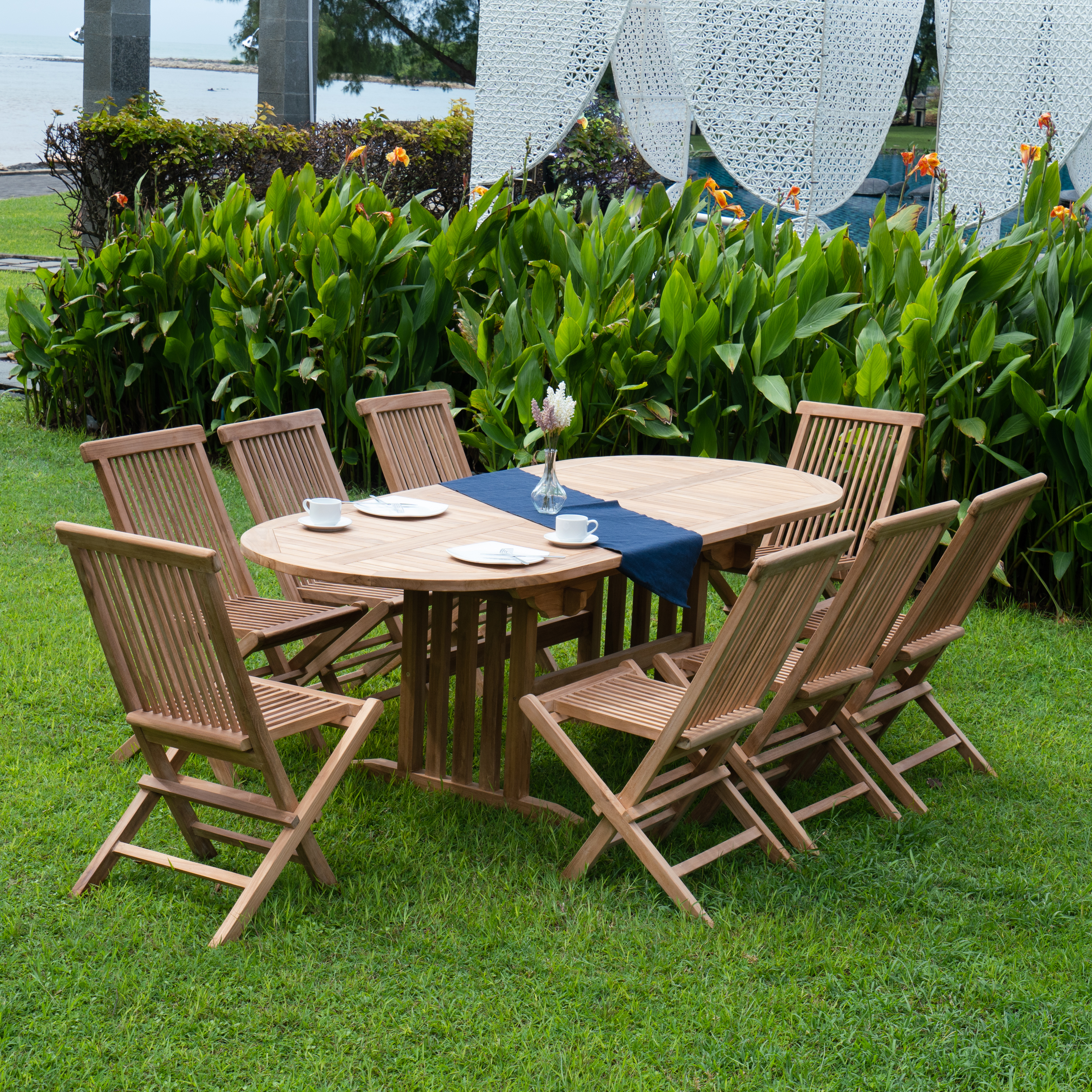 Saltö matgrupp för uteplatsen med ett förlängningsbart matbord i massiv teak, tillsammans med 8 stycken Saltö stolar i massiv teak. En modern kombination på uteplatsen.