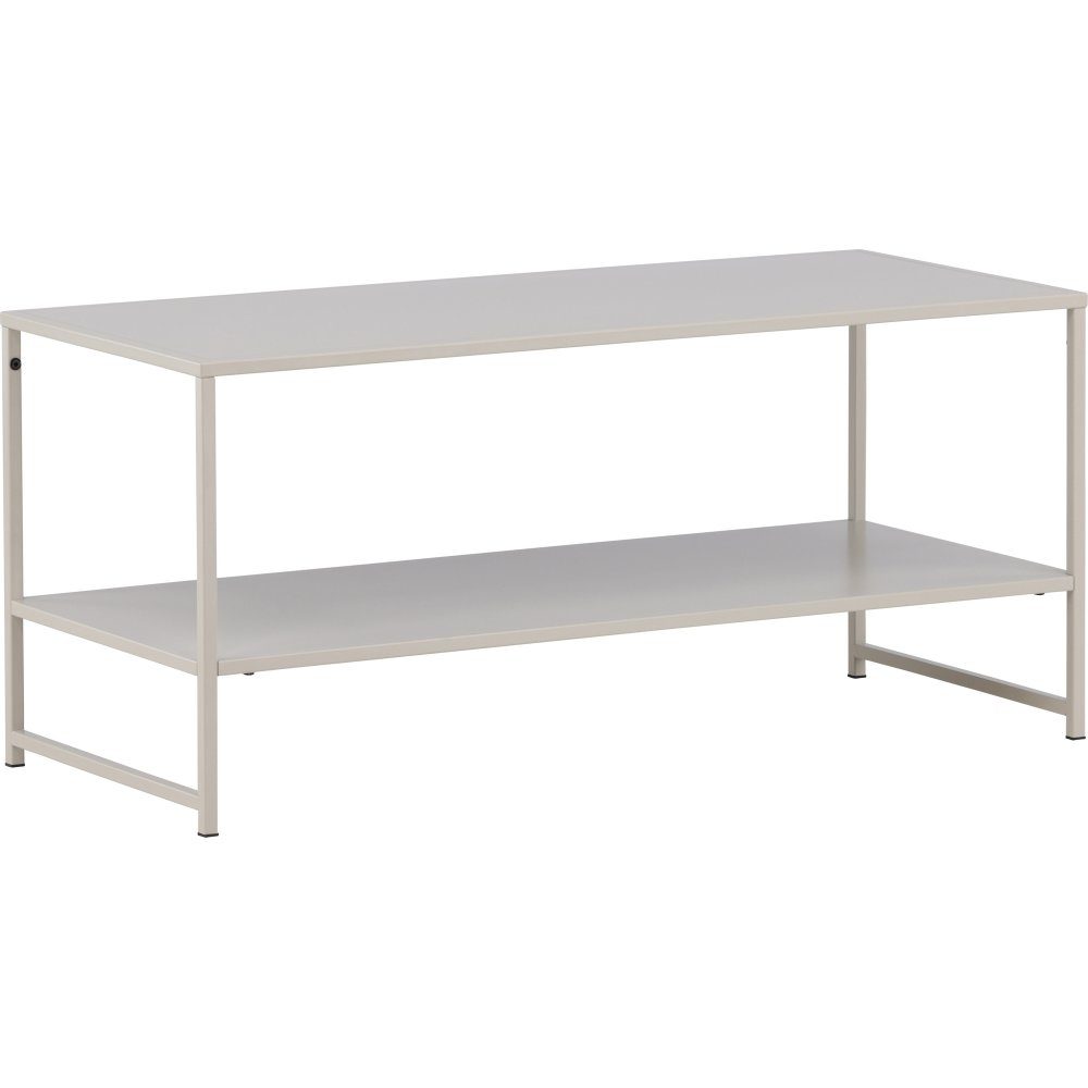Soffbord i modernt beige stål. Den genomtänkta minimalistiska designen med raka nordiska former skapar en luftig och modern känsla till rummet. Bordet är lika snyggt som praktiskt med ett smart hyllplan för böcker, dekorationer eller lite extra förvaringsyta.