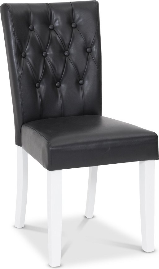 Helklädda stolar i svart PU-klädsel. En komfortabel och robust stol som ger ett gediget intryck och passar till många olika matbord. Vitlackade träben och knappar i ryggen som en trevlig detalj! Skålad rygg för att ge en skön sittkomfort!