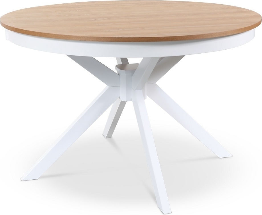 Tromsö matbord med rund snygg bordsskiva i naturfanérad ek. Vitlackat underrede.